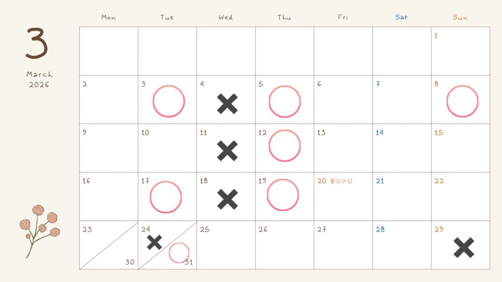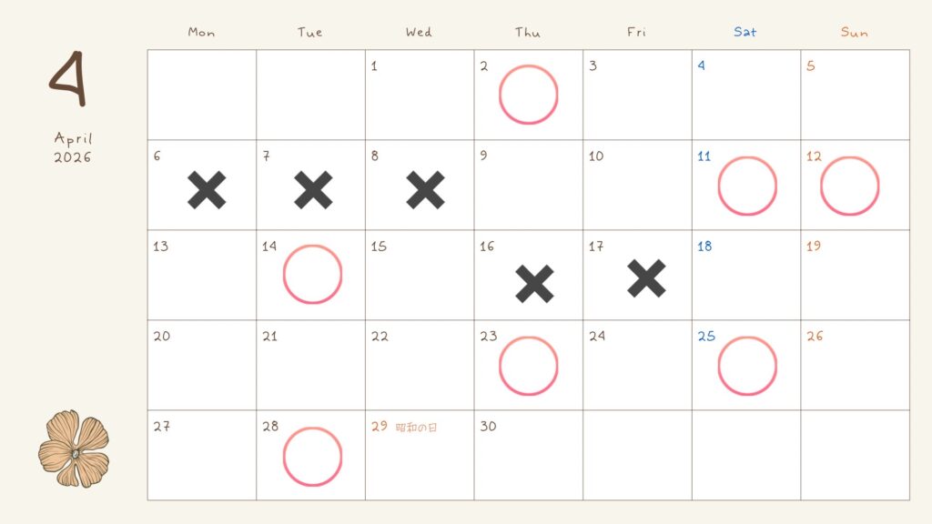 ✖印はレッスンをお受けできない日です。